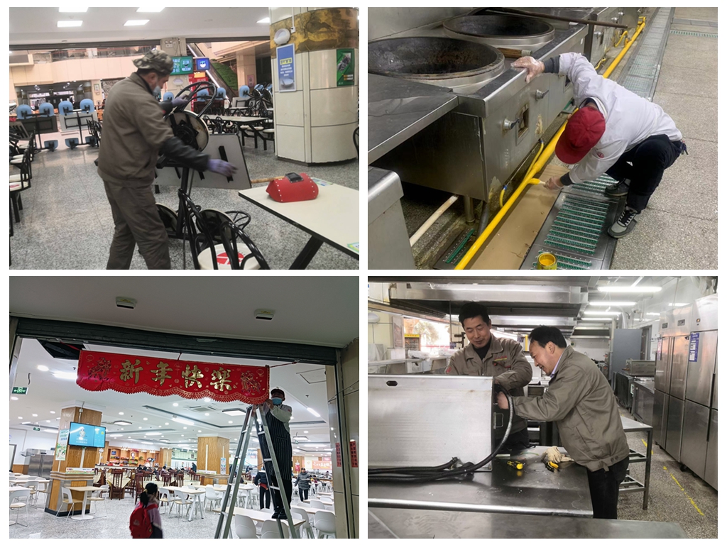 寒假时期,饮食中央对自然气管道、消防编制等配置方法展开周详检讨、维修,调动洗碗机、维修灶具餐具等,确保安然临盆;确定寒假时期供餐食堂,增强食物、临盆安然,采供、物供部分做好保险;对合停食堂举行联合检讨,聚合洗涤餐具、清扫卫生;增强寒假供餐食堂的食物安然监禁,营制新年气氛,做好春节留校学生团拜联欢合联处事;落实寒假时期值班值守。