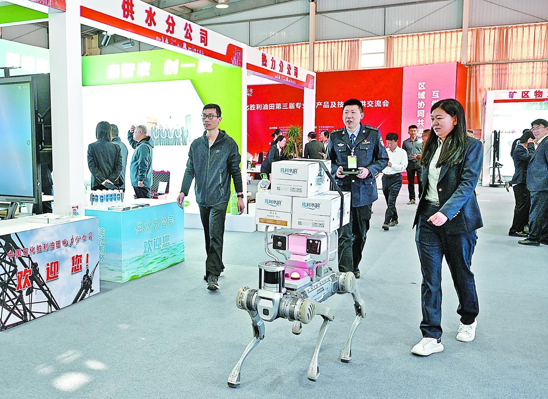呆板狗握手、作揖、舞蹈,憨态可掬;“胜小利”人工智能大模子智能对话,机敏滑稽……告捷油田胜中热力运维部体育馆内,一批科技感一概的展品,吸引了人们围观。